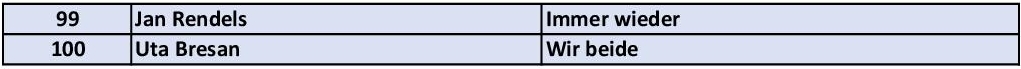 2005 1. Andrea Berg - Du hast mich 1000mal belogen 2. Wofgang Petry - Verlieben, verlorn, vergessen... 3. Robert Zephiro Milla - Herzraketen | |